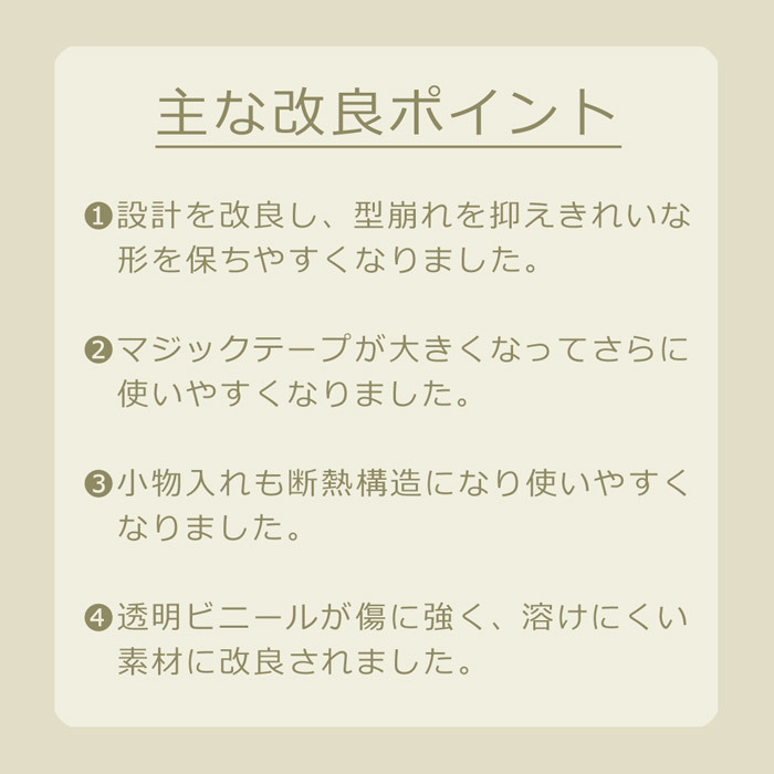 | 特徴 | ・雨の日、寒い日はもちろん、暑い日にも使えるオールシーズンタイプの子供のせ用レインカバー ・従来品より固定プレートのサイズ変更と取り付けベルト強化でカバーの安定感がアップ ・透明窓は傷が付きにくい素材でよりクリアな視界を確保 ・暑い日でも下カバーを外して、上カバーのみで独立して使用可能 ・日差しの向きや高さに合わせて上カバーの角度調整が可能 ・下カバー装着時でもお子様の乗せ降ろしが左右どちらからも楽にできる構造 ・下カバーには大きな窓付きでお子様も安心 ・軽くて強度のある芯材「POM」を採用し、型崩れを抑え空間を確保 ・分割式サブフレーム構造により使用時の歪みを防止 ・生地は丈夫な600Dポリエステルで、雨天にも対応する耐水圧1000mmをクリア(※完全防水ではありません。) ・外した下カバーの収納などに便利な背面ポケットは駐輪時のポケット内部の温度上昇を抑える断熱構造 ・盗難防止用のロック穴付き(※ロックは別売です。) |