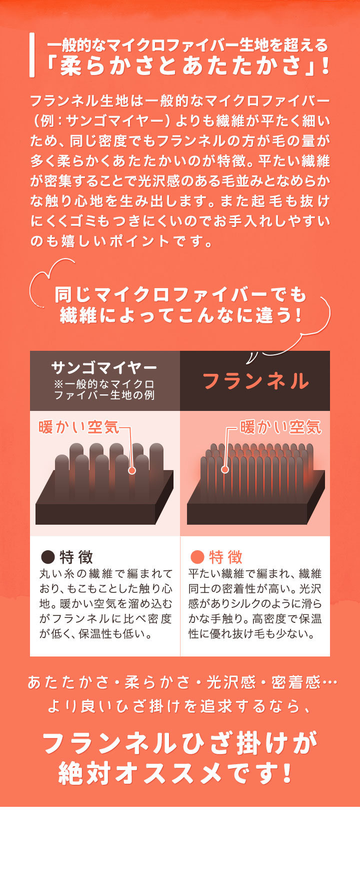 肌触りの良さに定評があるマイクロファイバーの中でも、特に柔らかいのがこの“フランネル”繊維!一般的なマイクロファイバーよりも繊維が平たく細いため、同じ密度でも、より毛の量が多く柔らかくあたたかいのが特徴。平たい繊維が密集することで光沢感のある毛並みとなめらかな触り心地を生み出します。