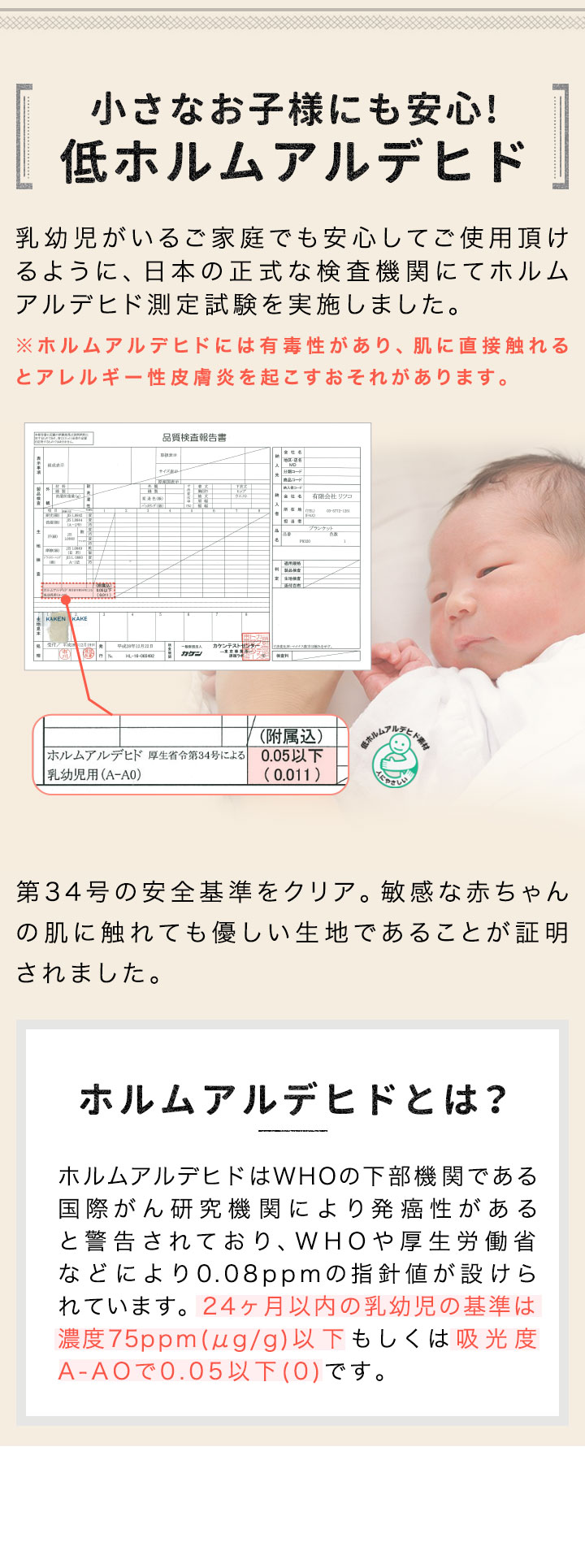 乳幼児がいるご家庭でも安心してご使用頂けるように、日本の正式な検査機関にてホルムアルデヒド測定試験を実施しました。