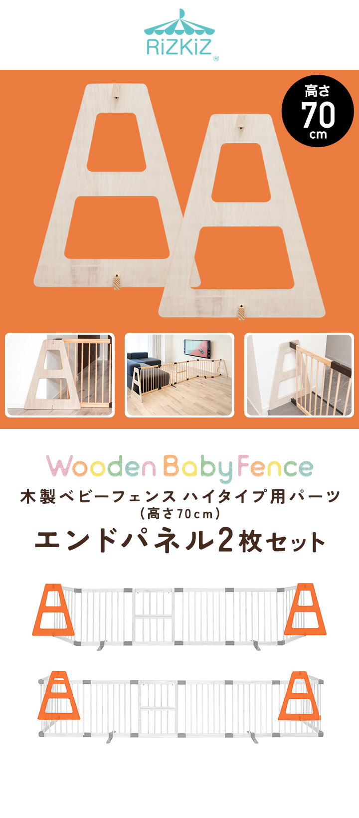 1年保証 RiZKiZ 高さ70cm木製ベビーフェンス・木製ベビーサークル用 追加・交換用 木製エンドパネル 2枚組 幅約60cm×高さ70cm ハイタイプ 追加パーツ 送料無料