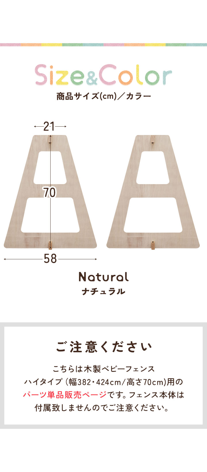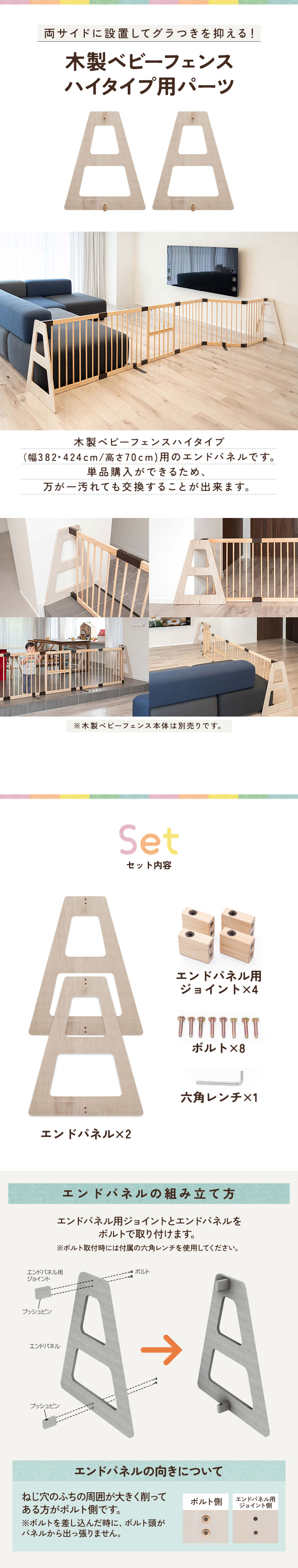 こちらは木製ベビーフェンスハイタイプ(高さ70cm)用のパーツ単品販売ページです。フェンス本体は付属致しませんのでご注意ください。