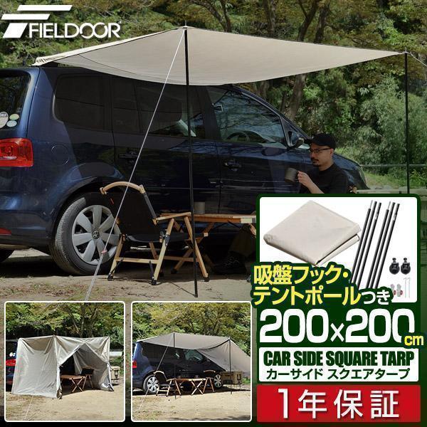 カーサイドタープ 1年保証 200cm×200cm 簡単 テントポール付き 車用 連結 オーニング ルーフテント 日よけ 車中泊 オートキャンプ 吸盤 2m FIELDOOR 送料無料