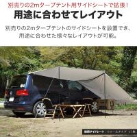 車を使って設置するスクエアタープです。2mタープテントのサイドシートを設置ができて、様々なレイアウトを楽しむことができます。