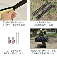 ウォールタイプで目隠しに、メッシュタイプで蚊帳替わりに、別売りの2mタープテント用のサイドシートを設置することができるので、用途に合わせた様々なレイアウトが可能です。