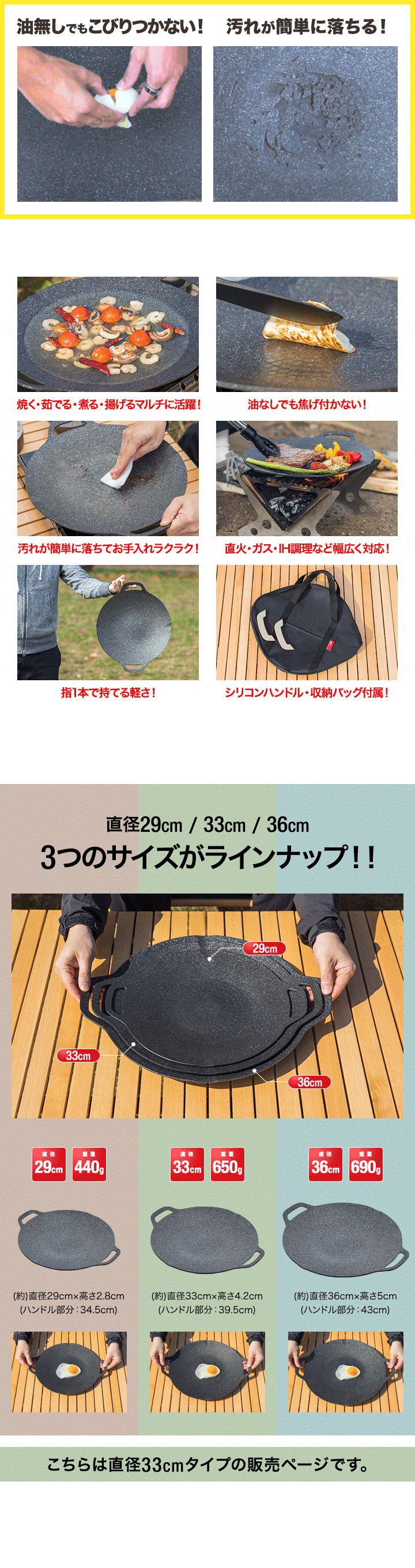 | 特記事項: ※直火・ガス・IH・電気調理器など様々な熱源で使用可能。 ※シーズニングは必要ありません。 ※食洗器には対応しておりません。 ※家庭用カセットコンロでご使用される場合、グリドルパンがカセットコンロ本体を覆ってしまうと輻射熱がガスボンベを発熱させる恐れがありますので、熱したグリドルパンまたはハンドルをガスボンベに触れない、近づけないよう、十分に注意して下さい。 ※収納袋の内側にはPVC(ポリ塩化ビニール)コーティングを施しています。PVC(ポリ塩化ビニール)コーティングには臭いが有り、開封直後は人によって過敏に感じやすい場合もございます。どうしても気になる場合などは、屋外など直射日光の当たらない風通しの良い場所で、1〜2日程度吊るしていただくと臭いが軽減します。 |