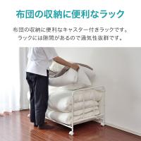 布団の収納に便利なキャスター付きラック。ラックは隙間があるので通気性抜群!床に直置きせずに清潔に収納できます。