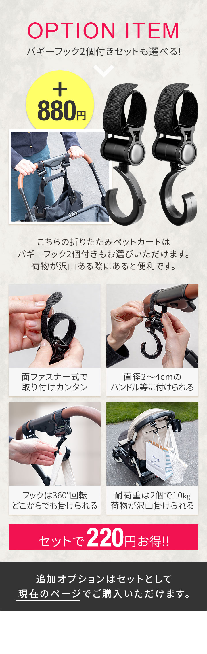 | 特記事項: ・ベビーカーに重い荷物を掛けたまま、お子様を降ろさないでください。ベビーカーが転倒するおそれがあります。 ・最大耐荷重は2個で10kgです。それ以上の重い荷物を掛けないでください。 ・滑りやすいグリップやパイプに取り付ける場合、フックがずれるおそれがあります。ものをかける前にズレやすい箇所に取り付けていないか確認してください。 ・万が一、破損・欠損などがあった場合は使用しないでください。 ・取り付け部の強度や耐荷重が不足している場合は転倒したり破損するおそれがあります。取り付け側の強度も併せてご確認ください。 |