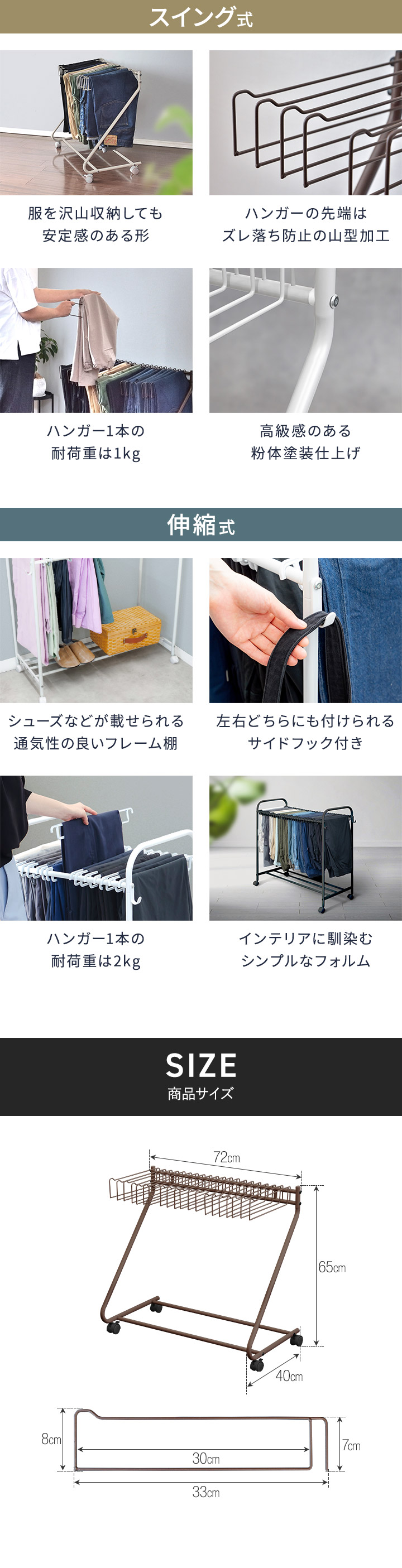 | サイズ: 本体 : (約)幅72cm×奥行40cm×高さ65cm ※ハンガー1本あたり : (約)幅33cm×高さ8cm |