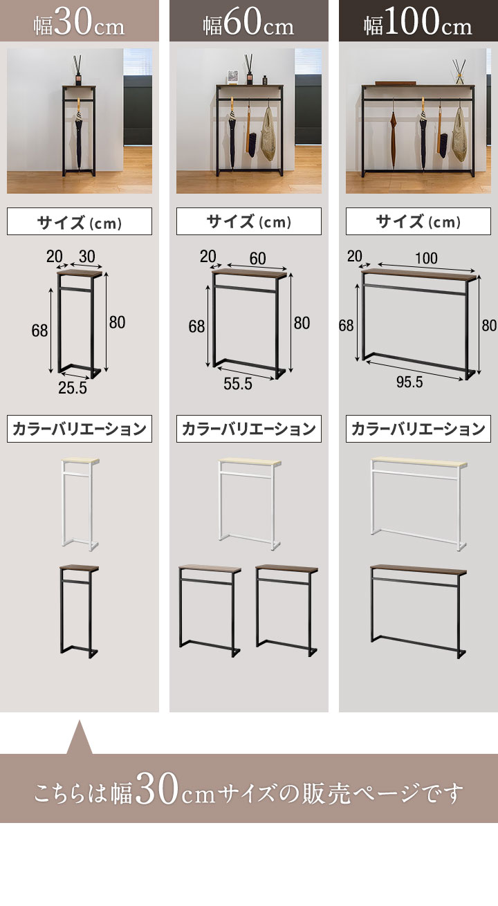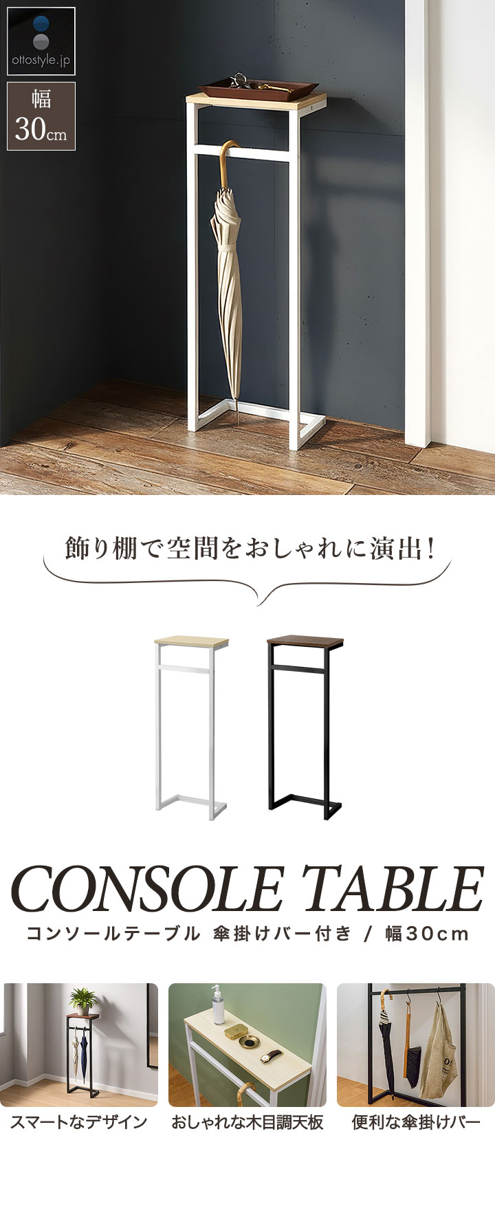 コンソールテーブル 傘掛けバー付き 幅30cm