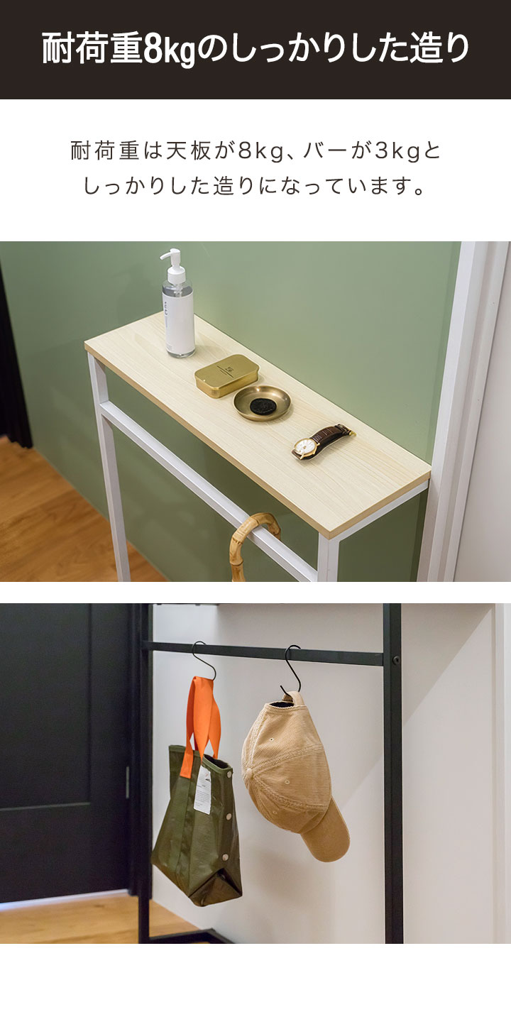 耐荷重は天板が8kg、バーが3kg、しっかりした造りになっています。