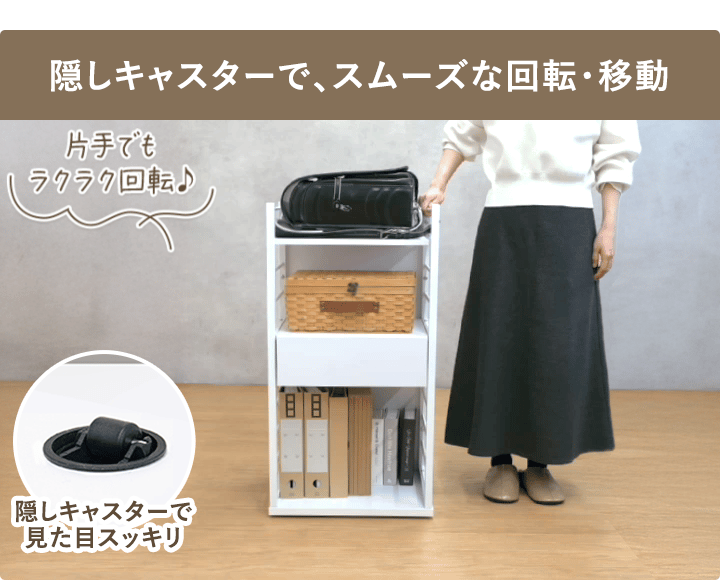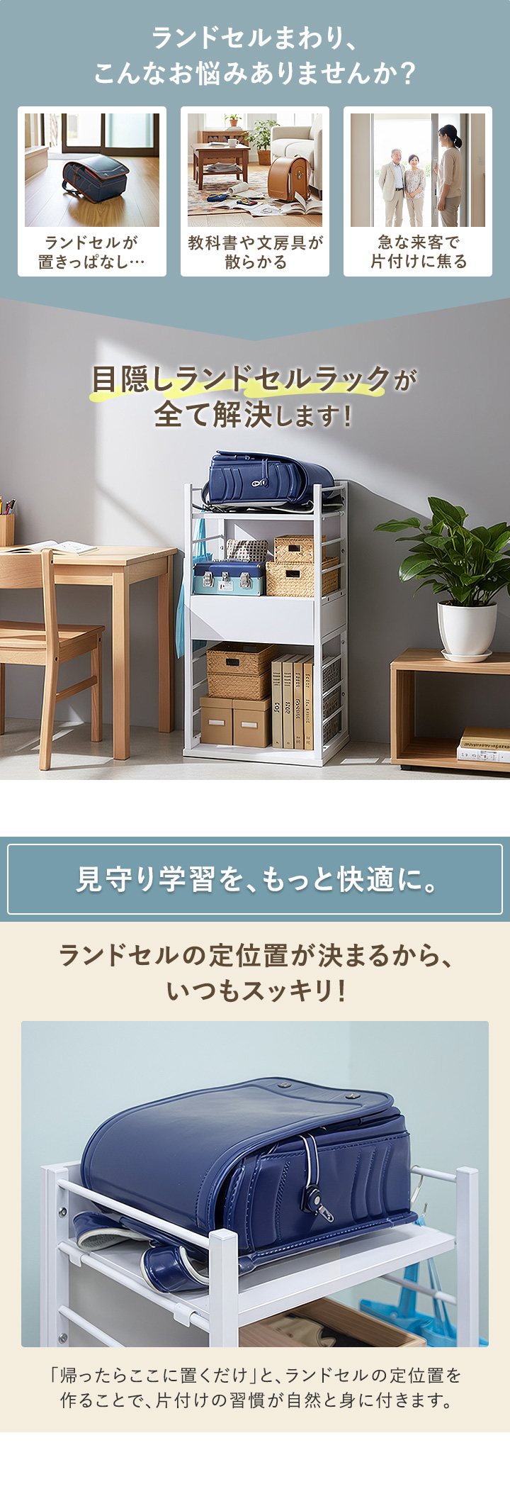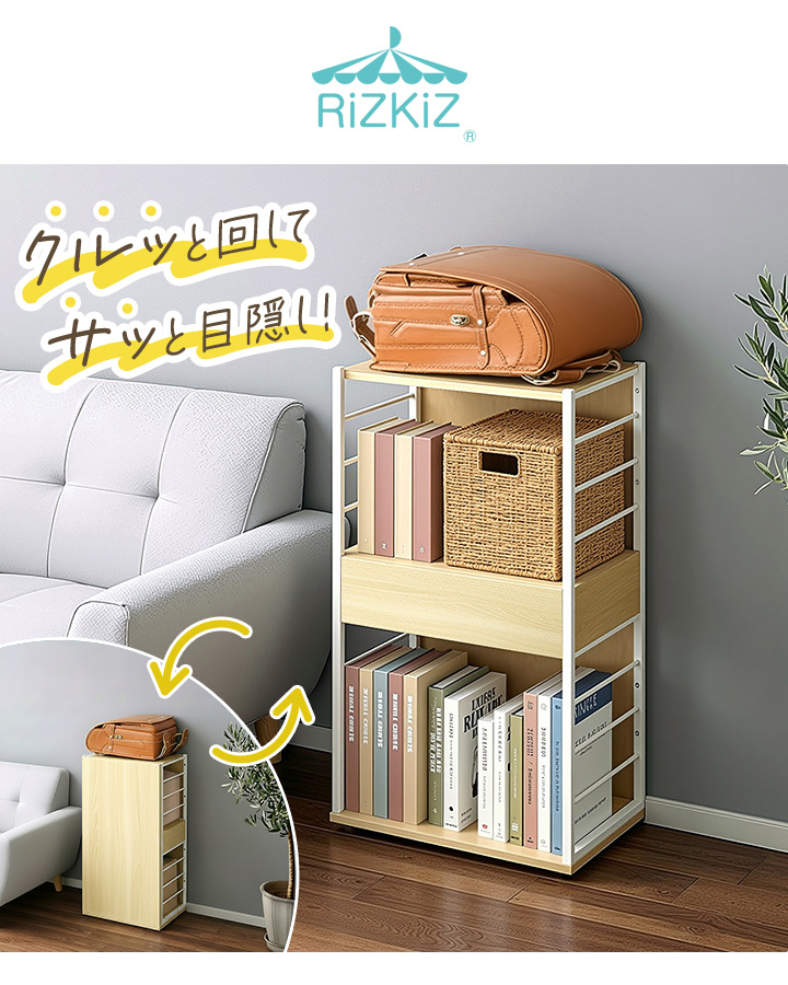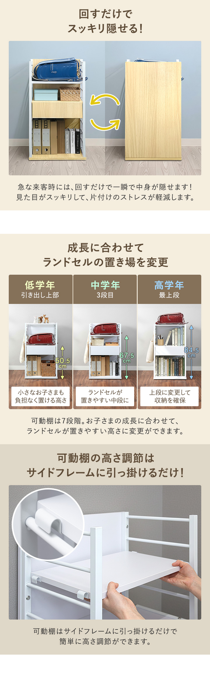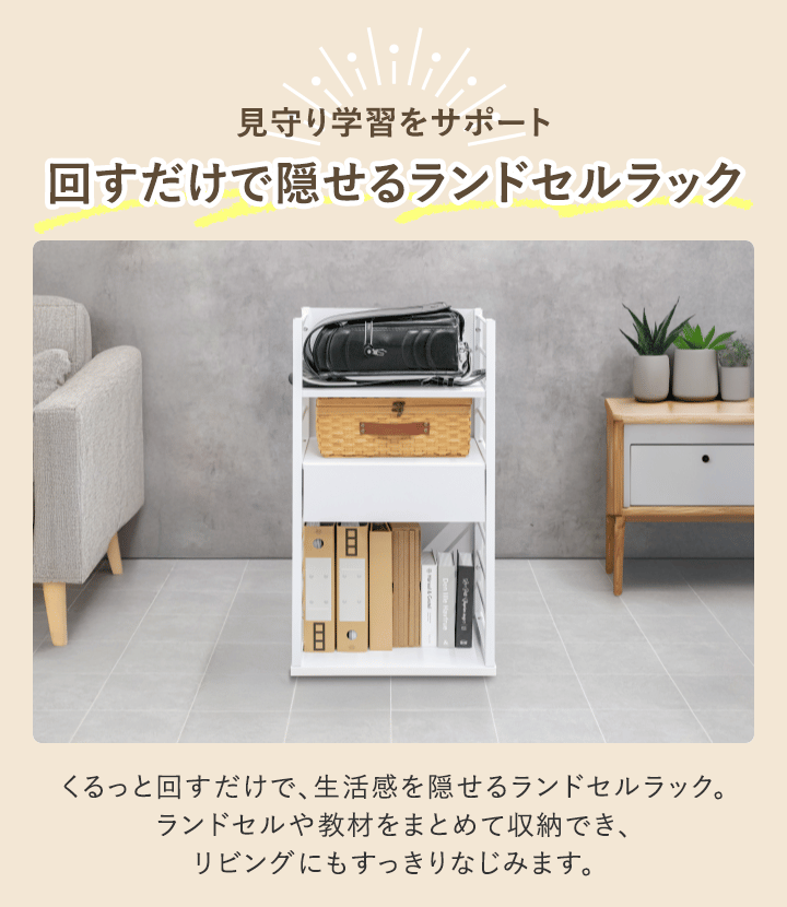 くるっと回すだけで、生活感を隠せるランドセルラック。ランドセルや教材をまとめて収納でき、リビングにもすっきりなじみます。