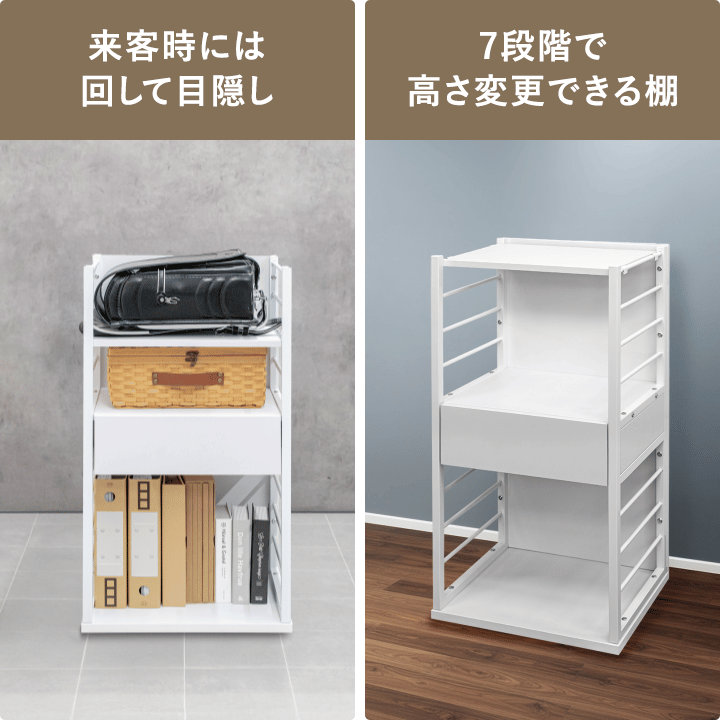 可動棚は7段階。小学校低学年〜中学年〜高学年と、お子さまの成長に合わせて、ランドセルが置きやすい高さに変更ができます。高さ調節は棚板をサイドフレームに引っ掛けるだけで簡単設計です。