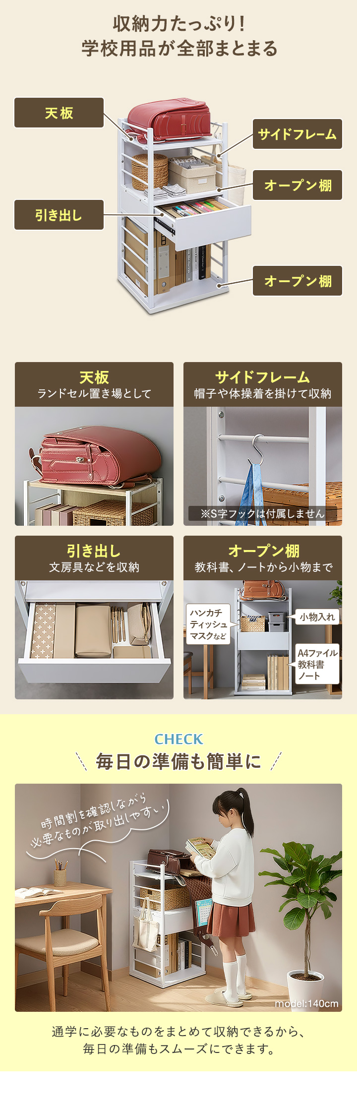 時間割を確認しながら必要なものが取り出しやすいよう、通学に必要なものをまとめて収納できるので毎日の準備もスムーズにできます。
