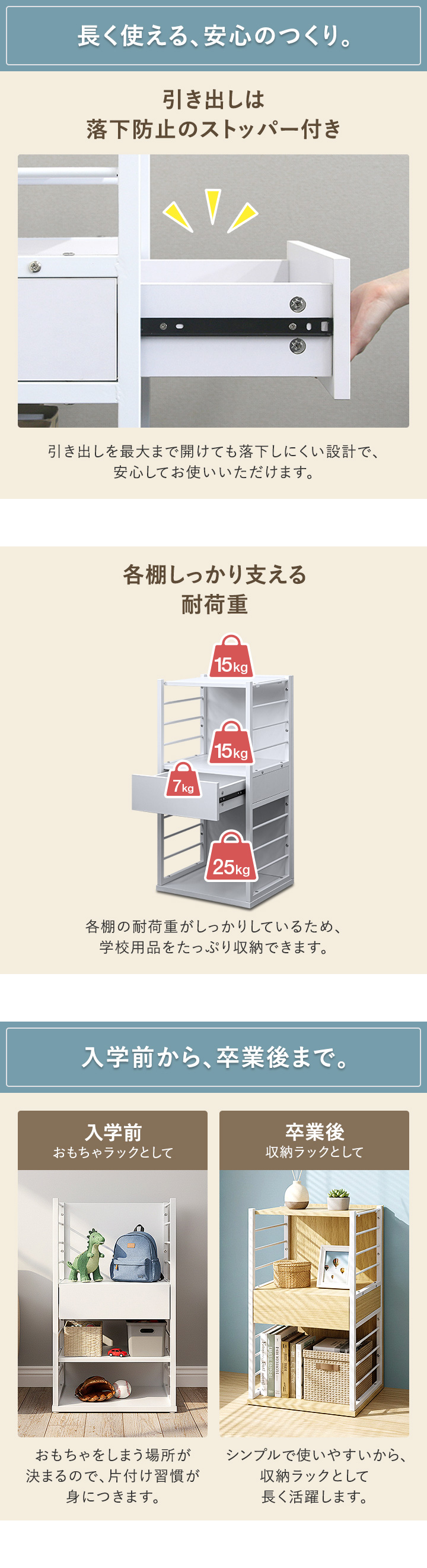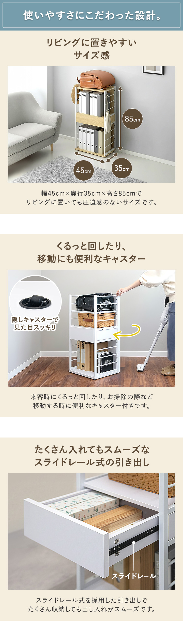 スライドレール式採用で、たくさん収納しても出し入れがスムーズな引き出しは落下防止のストッパー付き。引き出しを最大まで開けても落下しにくい設計で、安心してお使いいただけます。