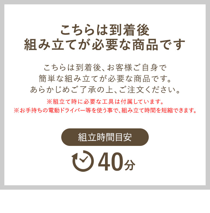 ※組み立ての際は、電動ドライバーの使用を推奨します。お手持ちの電動ドライバーを使うことで、組み立て時間を短縮することができます。