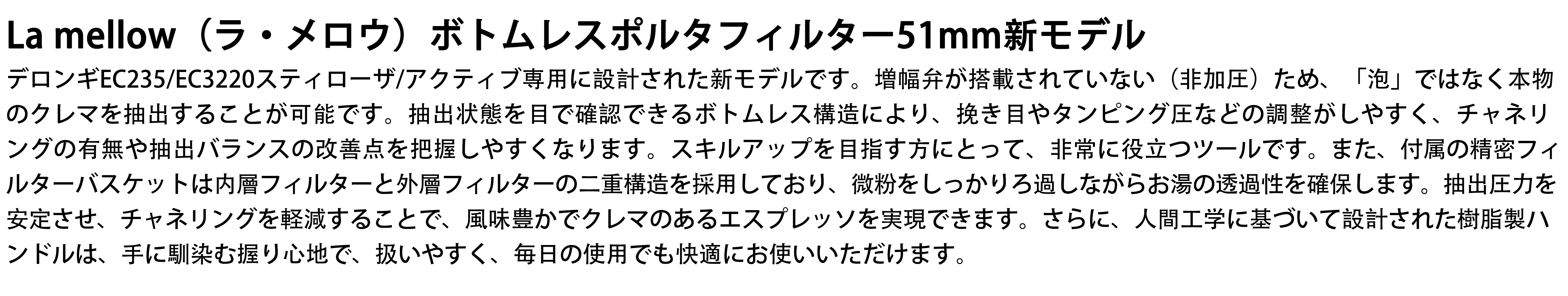 La mellow(ラ・メロウ) デロンギ用ポルタフィルター51mm ボトムレス EC235/ECP3220用 精密フィルターバスケット 非加圧 スティローザ/アクティブ エスプレッソ