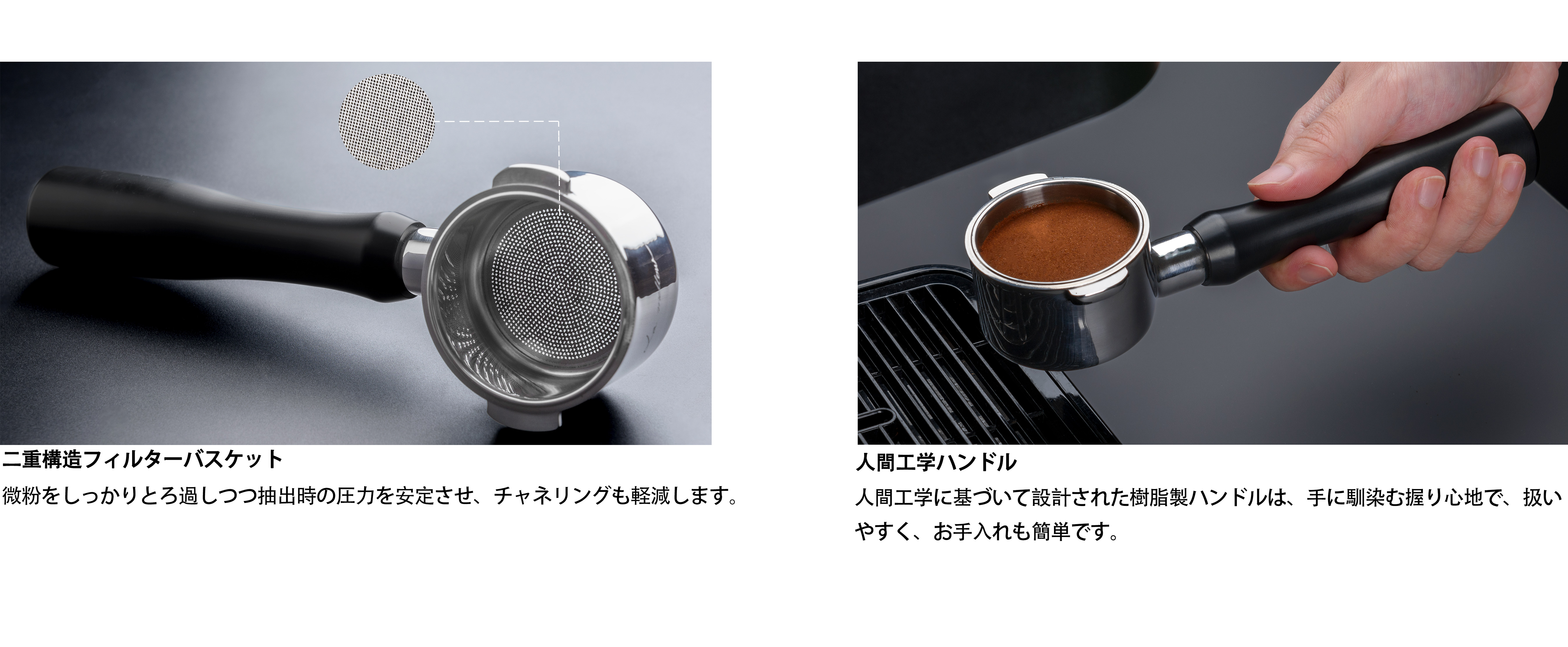 精密フィルターバスケットを付属しております。内層と外層の二重構造により、微粉をしっかりとろ過しつつ抽出時の圧力を安定させ、チャネリングも軽減します。