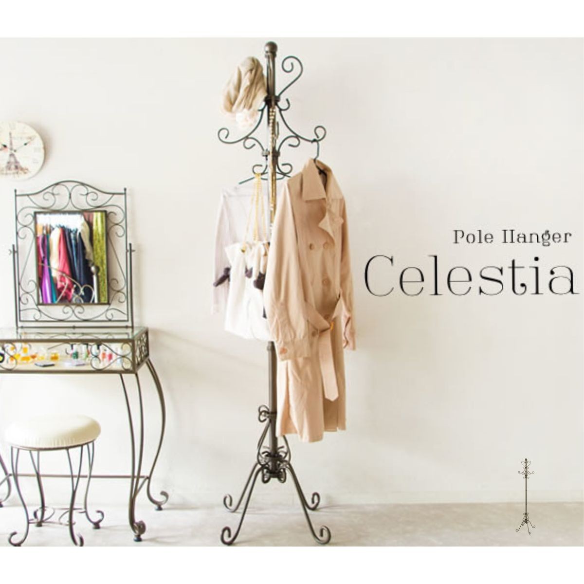 曲線が美しいロートアイアンデザイン、高級感のあるゴールドカラーが目を引く『Celestia(セレスティア)』のポールハンガー