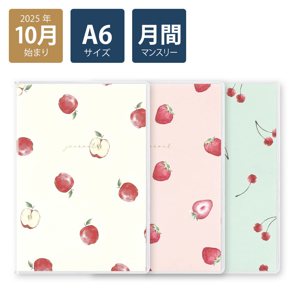 【2026年手帳/2025年10月始まり】スケジュール帳 ダイアリー 月間 月曜始まりA6マンスリーType3 フリュイ(ホワイト/ピンク/グリーン)《おしゃれ/大人/かわいい/可愛い/フルーツ柄/果物/りんご/いちご/さくらんぼ》【ラボクリップ】