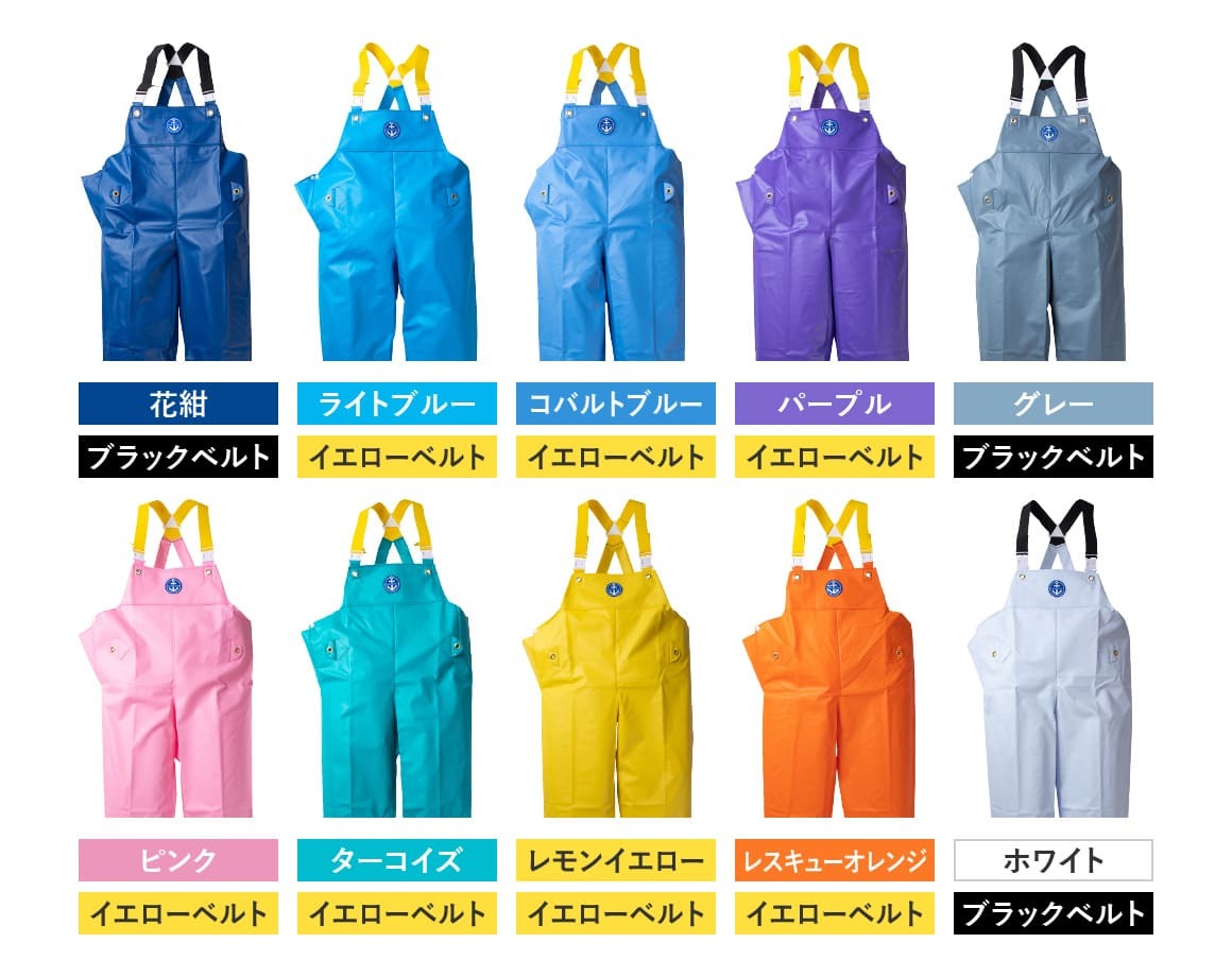 プロ仕様の水産合羽です。胸付きタイプのマリンズボンこちらはLLサイズまでの購入可能です。【ターコイズ】【花紺】以外はメーカー取り寄せの為発送まで一週間ほどいただきます。漁師の方はもちろん水場でのお仕事、釣りなど様々な現場に活躍!!柔らかい素材で着心地が良く、長時間使っても疲れにくい雨合羽です。質の高い日本製生地をプロが丁寧に縫製して作られた雨合羽です。冬場など寒い時期は中に着込みますので大きめのサイズをおすすめします。【使用】・大きめバックル・ゆとりがあり重ね着OK・小用時にズボンが落ちないベルト端にホック付き・内側にポケットティッシュが入るサイズのポケット付き・着脱しやすい右腰にホック付き・豊富なカラーバリエーション・厚さ0.35mm(弊社では花紺とターコイズは0.45mmとなります)・柔らかく生地裏はサラサラしており着心地バツグン