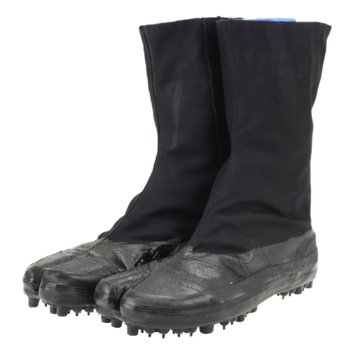 ピンの数が多く滑りにくく、よく足にフィット!!山林作業、山菜採り、狩猟、沢釣り、 傾斜地での草刈りなどにおすすめの製品です。甲部の特殊コーティングは水の浸入を防ぎ、指股部の柔軟な水かき状のつなぎ片は草や砂利の侵入を防止します。ゴムとコーティングで水の侵入を防ぐ防水膜採用。片足に55本のピンスパイクで滑りくいアウトソールとなっています。10枚コハゼに4かけ糸で快適な作業が可能に。甲材: 綿 底材: ゴム+金属ピン