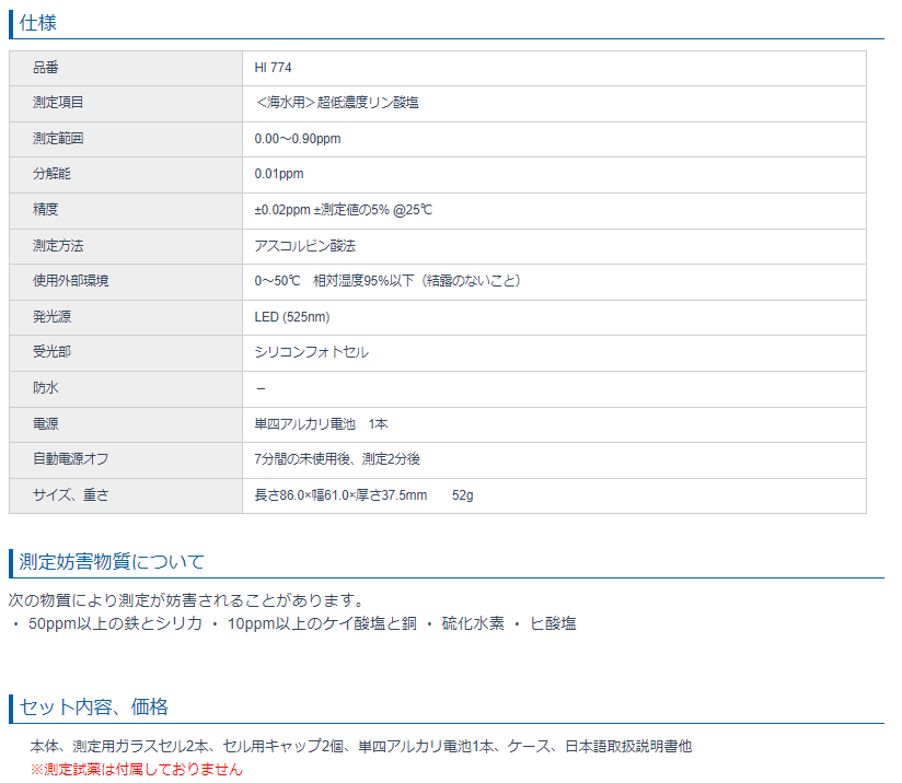 海水用/超低濃度リン酸塩チェッカー HI 774(0.00〜0.90ppm)