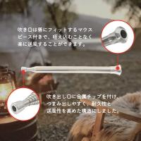 バーベキューや焚き火、キャンプなどで火種を素早く効率良く育てることができる、アウトドアに必携な便利アイテムです。 離れた場所から火元にピンポイントで空気を送ることができ、火傷や灰が舞う心配もなく安全に火を扱うことができます。 伸縮式なのでボールペンサイズまで短くなり、コンパクトに持ち運び可能。 最長63.5cmまで伸びるので、顔や髪に熱の影響を与えることなく、火力の調整ができます。 先端の吹出し口には細径の金属チップを付けることで、耐久性と送風性を高めております。 チップをつまむことで、スムーズに伸び縮みさせることができる取り回しの良さが特徴です。 唇にフィットするマウスピース付きで、咥え込むことなく楽に送風することができます。 オールステンレスなので錆びにくく、長くお使いいただけます。 携帯性、機能性、利便性のバランスが取れた一品です。 火元から15~20cm程離れた距離で、細く長く吹き込むのが効果的です。 ※先端の金属チップは耐熱接着剤を用いて接着しておりますが、本体が高温になったり衝撃が加わることで取れてしまう可能性がございます。 その場合は耐熱温度300℃以上の耐熱接着剤で、再度接着してください。