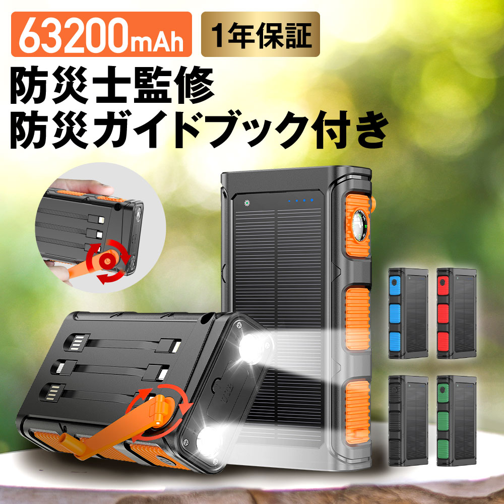 【防災士監修】モバイルバッテリー ソーラー 63200mAh スマホ充電 3WAY充電 2台同時充電 手回し 急速充電 LED【1年保証&説明書&防災ガイドブック付】