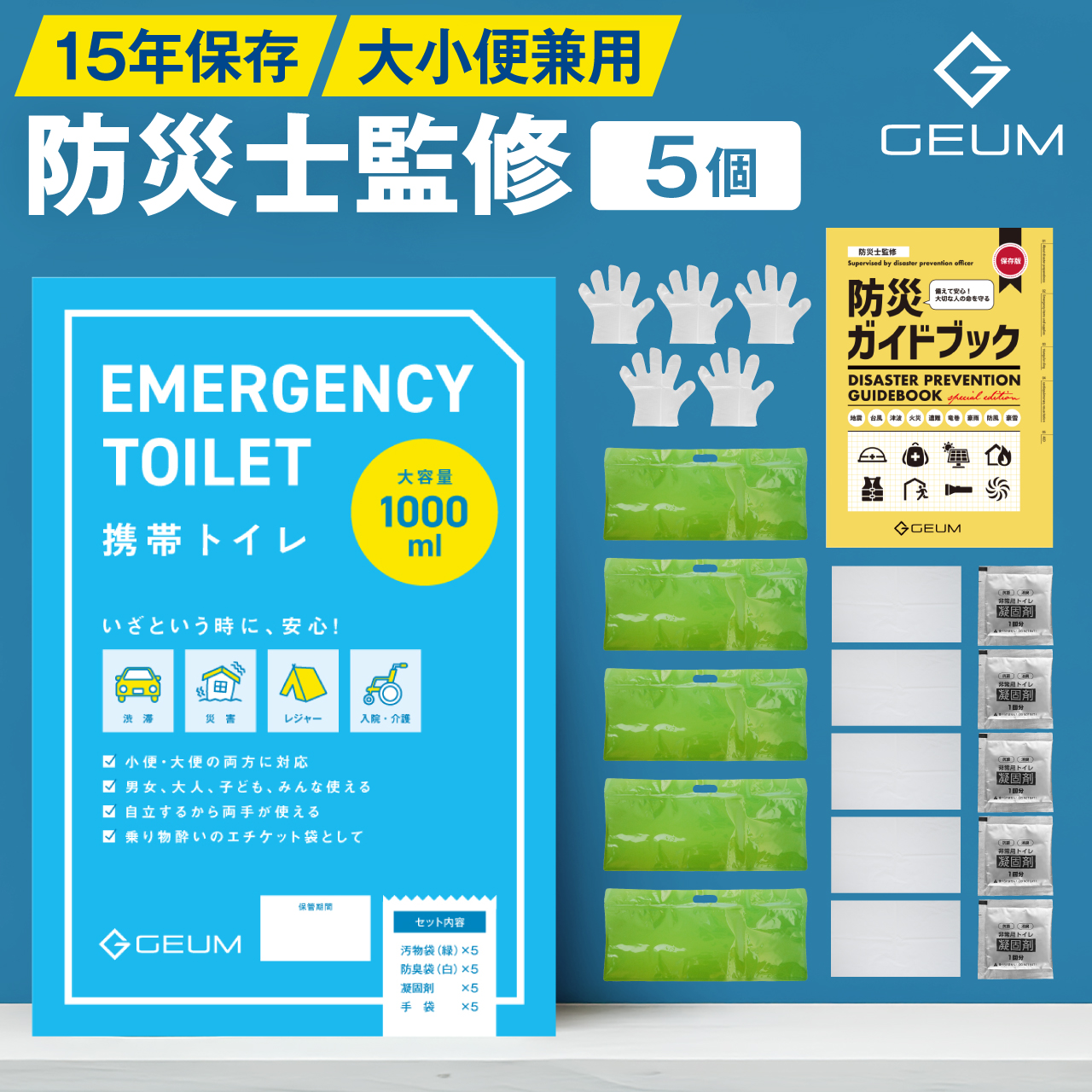 汚物袋(緑) 5枚、防臭袋(白) 5枚、凝固剤 5個、手袋 5組、取扱説明書及び保証書、防災ガイドブック