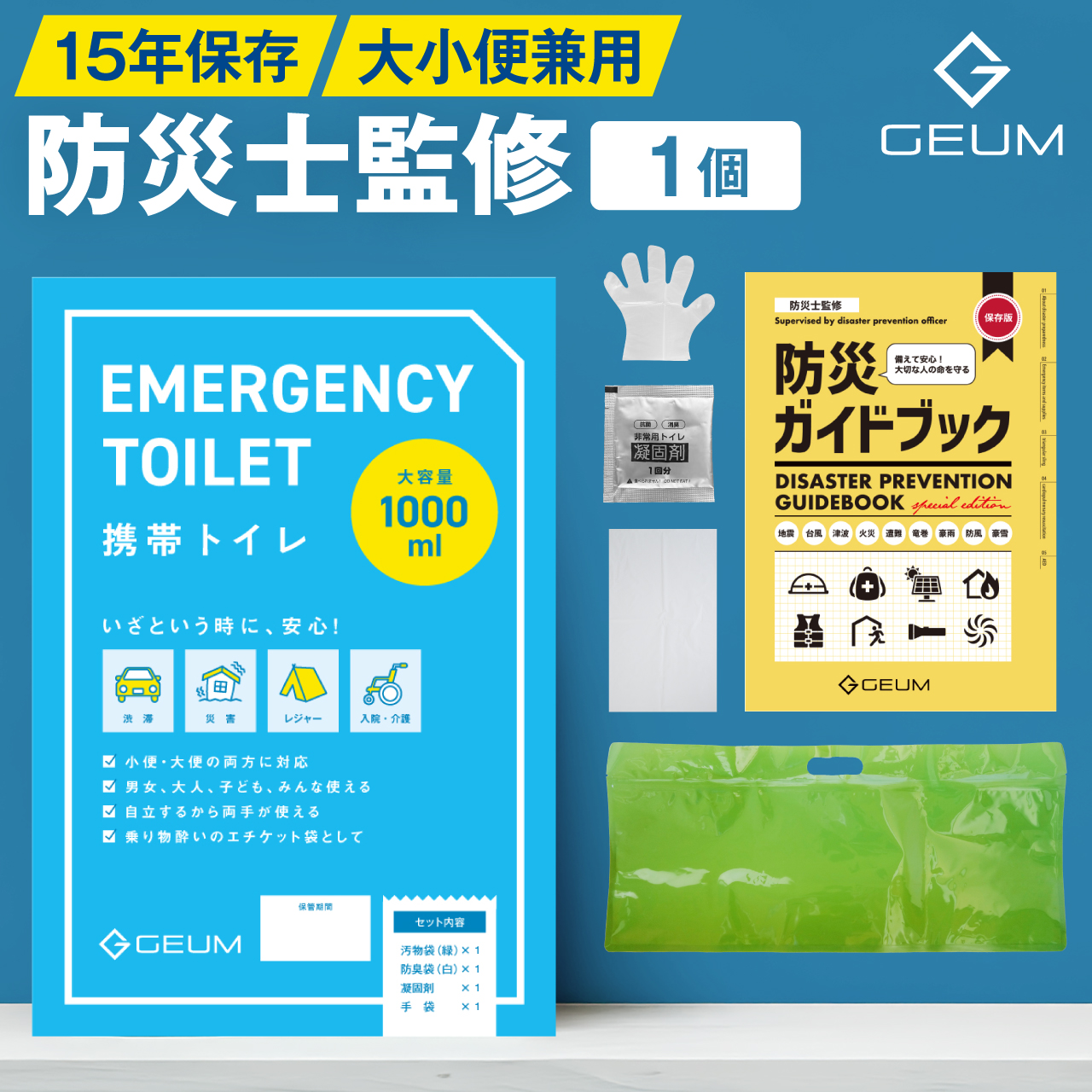 汚物袋(緑) 1枚、防臭袋(白) 1枚、凝固剤 1個、手袋 1組、取扱説明書及び保証書、防災ガイドブック