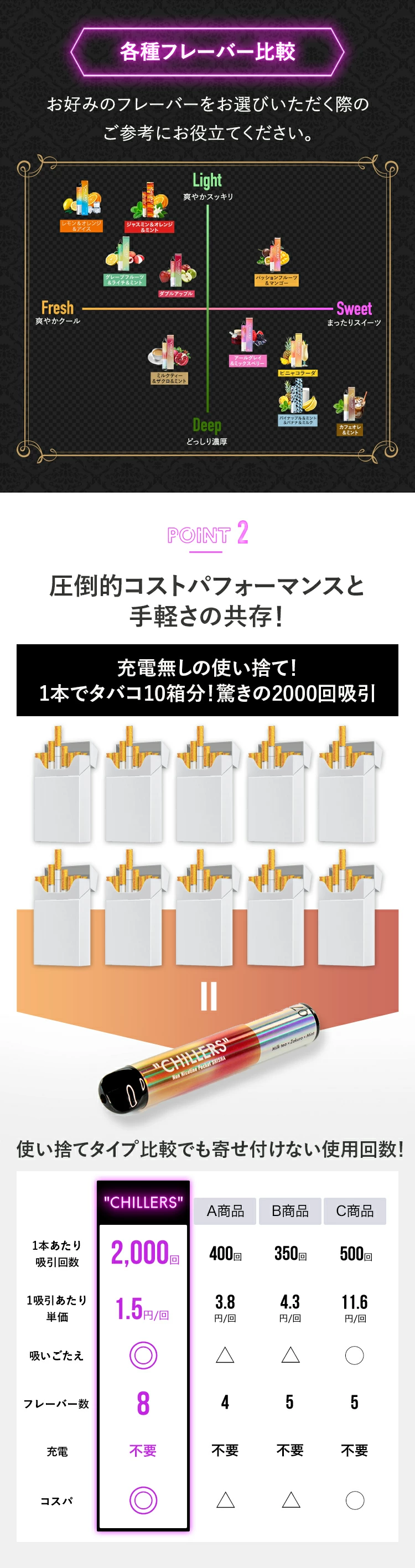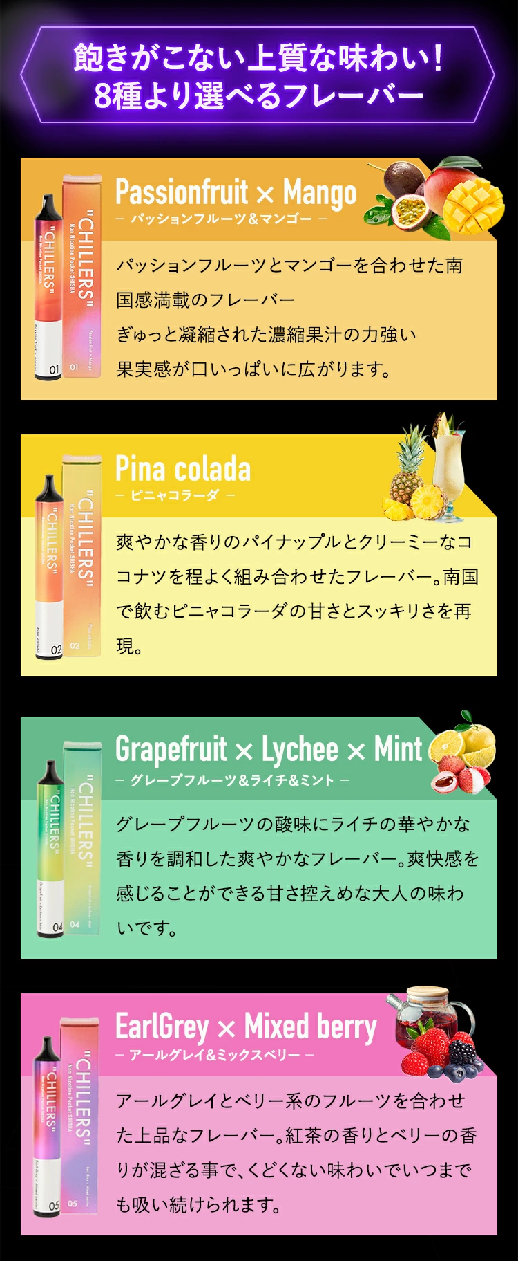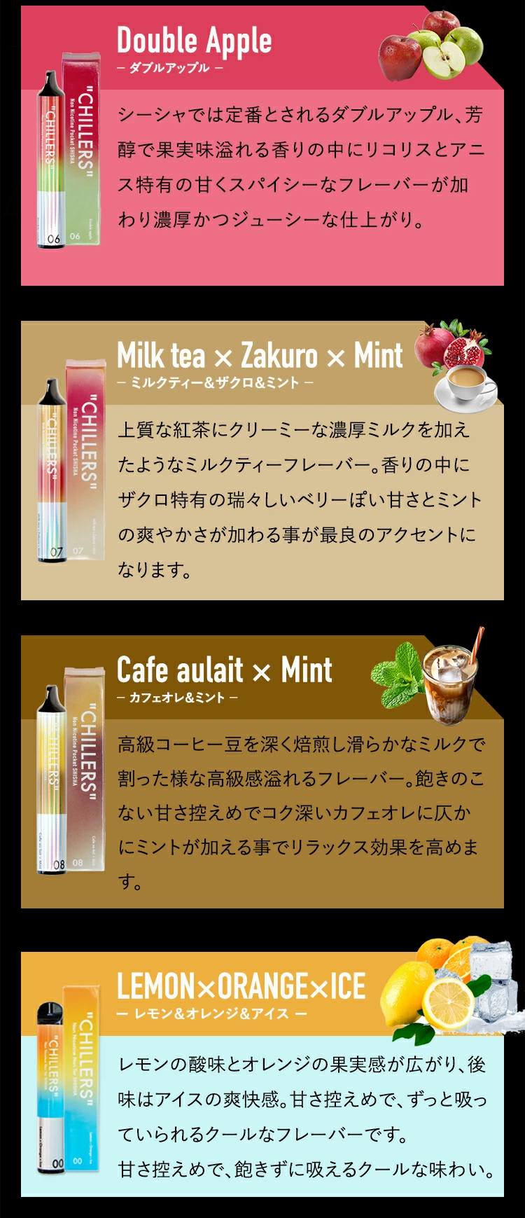 | フレーバー説明 | 【パッションフルーツ×マンゴー】 パッションフルーツとマンゴーを合わせた南国感満載のフレーバー。ぎゅっと凝縮された濃縮果汁の力強い果実感が口いっぱいに広がります。 【ピニャコラーダ】 爽やかな香りのパイナップルとクリーミーなココナツを程よく組み合わせたフレーバー。南国で飲むピニャコラーダの甘さとスッキリさを再現。 【グレープフルーツ×ライチ×ミント】 グレープフルーツの酸味にライチの華やかな香りを調和した爽やかなフレーバー。爽快感を感じることができる甘さ控えめな大人の味わいです。 【アールグレイ×ミックスベリー】 アールグレイとベリー系のフルーツを合わせた上品なフレーバー。紅茶の香りとベリーの香りが混ざる事で、くどくない味わいでいつまでも吸い続けられます。 【ダブルアップル】 シーシャでは定番とされるダブルアップル。芳醇で果実味溢れる香りの中にリコリスとアニス特有の甘くスパイシーなフレーバーが加わり濃厚かつジューシーな仕上がり。 【ミルクティー×ザクロ×ミント】 上質な紅茶にクリーミーな濃厚ミルクを加えたようなミルクティーフレーバー。香りの中にザクロ特有の瑞々しいベリーぽい甘さとミントの爽やかさが加わる事が最良のアクセントになります。 【カフェオレ×ミント】 高級コーヒー豆を深く焙煎し滑らかなミルクで割った様な高級感溢れるフレーバー。飽きのこない甘さ控えめでコク深いカフェオレに仄かにミントが加える事でリラックス効果を高めます。 【レモン×オレンジ×アイス】 レモンの酸味とオレンジのフルーティーな香り、後味爽やかなフレーバー。ぎゅっと凝縮された濃縮果汁の力強い果実感が口いっぱいに広がるフレーバーに、後から追いかけてくるアイスの清涼感は最高級の体験を味わうことができます。 |