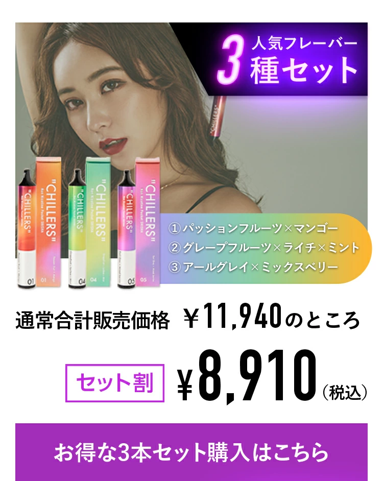 | セット内容 | レモン×オレンジ×アイス、パイナップル×ミント×バナナ×ミルク、ジャスミン×オレンジ×ミント 各1本ずつ |
