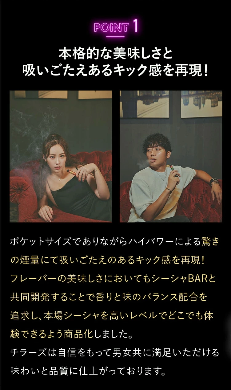 | 注意点 | ・本製品カートリッジ内のフレーバーリキッドには、ニコチンは一切含まれておりません。 ・妊娠中または授乳中の方、医師により使用を禁じられている方は本製品を使用しないでください。 ・本製品を使用するときは、関連法令や公共マナーなどを遵守してご使用ください。 ・本製品をご自分で修理・分解・改造しないでください。また、落としたり、衝撃を加えたり、無理な力を加えたり、重いものを上に乗せないでください。 ・直射日光、高温多湿、水濡れ、火気の近く、引火性物質(ガソリン、シンナー、ベンジン、ガス)の近くの場所を避けて、常温(25度前後)で保管・ご使用ください。 ・お子様の手の届かない場所に保管してください。小さいお子様が誤飲するおそれがあります。万が一飲み込んだ場合には、ただちに医師の診察を受けてください。 ・本製品を使用中に身体に合わないと感じた場合や気分が悪くなった場合には、ただちに使用を中止し、医師の診察を受けてください。 |