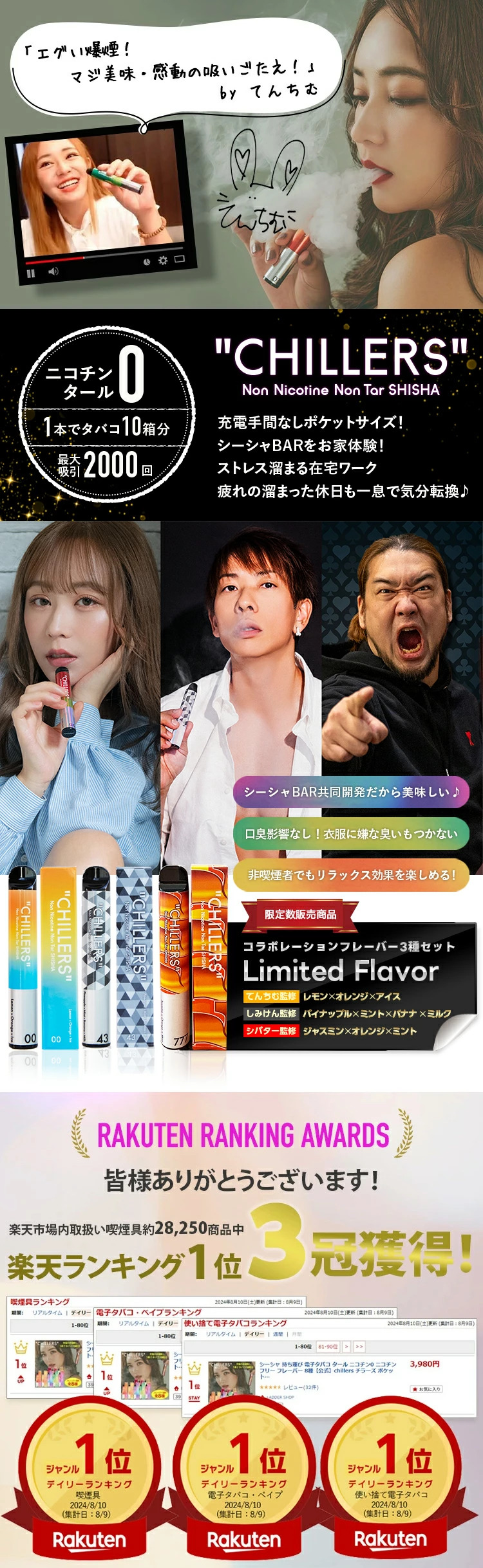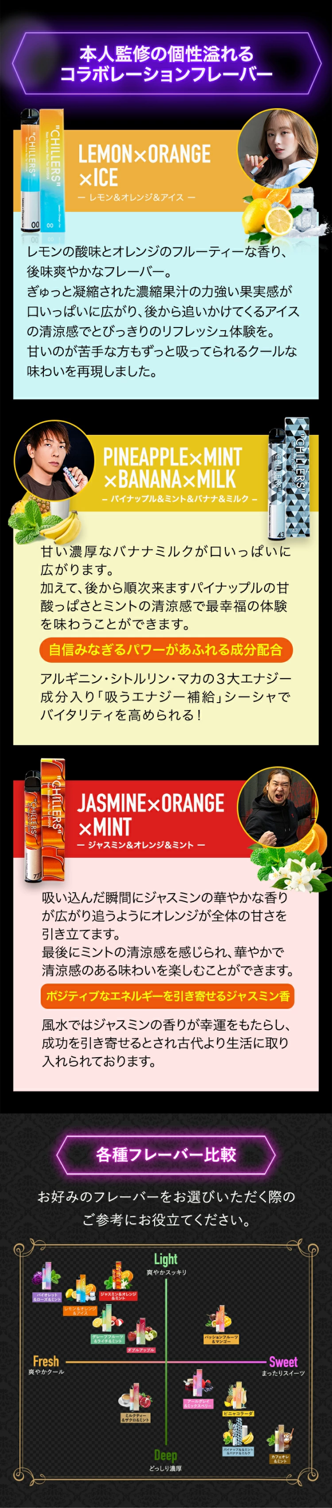 | フレーバー説明 | 【レモン×オレンジ×アイス】 レモンの酸味とオレンジのフルーティーな香り、後味爽やかなフレーバー。ぎゅっと凝縮された濃縮果汁の力強い果実感が口いっぱいに広がるフレーバーに、後から追いかけてくるアイスの清涼感は最高級の体験を味わうことができます。 【パイナップル×ミント×バナナ×ミルク】 アルギニン・シトルリン・マカの3大エナジー成分入りのフレーバーです。 バナナの甘いリッチなノートに加え、ミルクのまろやかさで全体のバランスを整えてくれます。甘い濃厚なバナナミルクが口いっぱいに広がります。加えて、後から順次来ますパイナップルの甘酸っぱさとミントの清涼感で最高峰の体験を味わうことができます。 【ジャスミン×オレンジ×ミント】 ジャスミンの華やかな香りが吸い込んだ瞬間に感じることができます。それに加えオレンジが全体の甘さを引き立てます。最後にミントの清涼感を感じることができ、華やかで清涼感のある味わいを楽しむことができます。 |