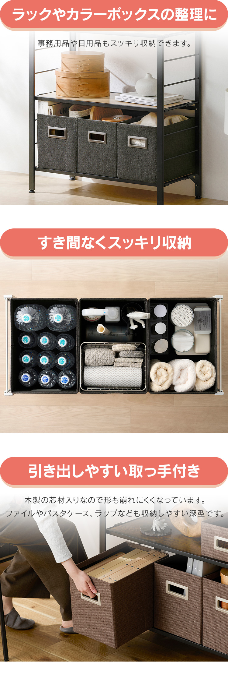 収納したい物に合わせて選べるサイズラインナップで、事務用品や日用品の収納にも使い勝手がよく、隙間なくスッキリ収納することができます。