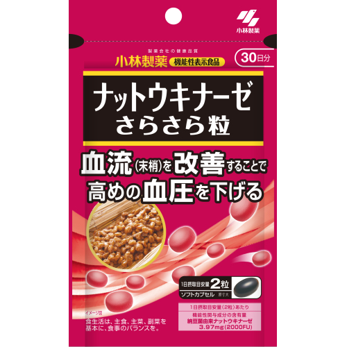 血流(末梢)を改善することで高めの血圧を下げる。本品には納豆菌由来ナットウキナーゼが含まれる。着色料、香料、保存料すべて無添加。機能性表示食品。