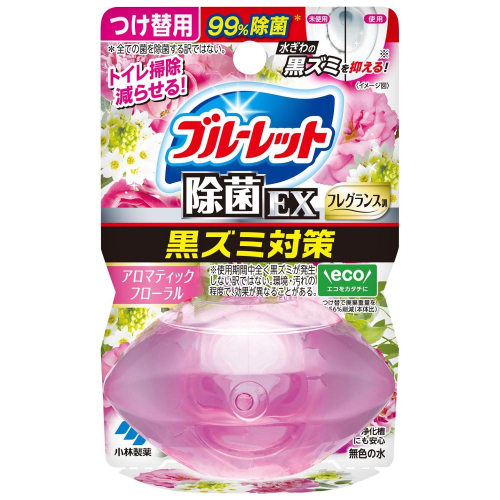 | 除菌率99%※1で水ぎわの黒ズミの発生を抑え※2、お掃除が楽になります。(※1水ぎわの黒ズミ原因菌への効果。全ての菌を除菌する訳ではない。当社の実験室内の検証結果による。※2使用期間中、まったく黒ずみが発生しないわけではない) 洗浄防汚成分を配合、便器をコートし、汚れの付着を抑え、便器のきれいを保ちます。(環境汚れの程度で、効果が異なることがある。水の流れない部分の汚れは防げない) 標準的な使用で約1ヶ月間(3〜4週間)使用できます。(気温、水温、水量などにより、期間が異なることがあります) 流れる水は無色です。 便器やタンクに影響を与えません。本品はタンク内の器具、便器、浄化槽及び浄化槽内のバクテリアへの影響に配慮し設計しています。 アロマティックフローラルの香り。 つけ替用。 |