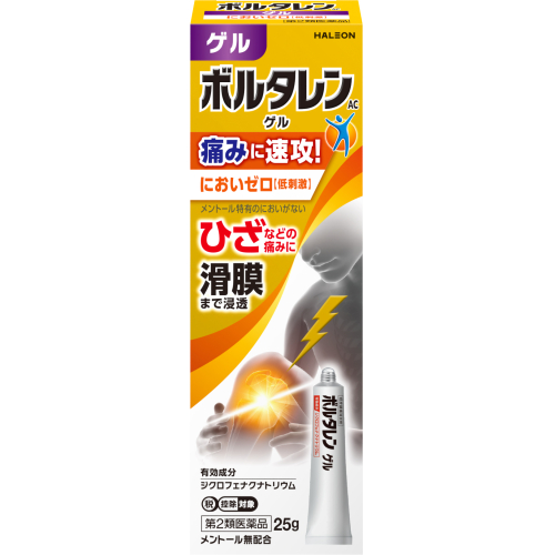 ボルタレンACゲルは,ジクロフェナクナトリウムを配合した鎮痛消炎ゲル剤で,優れた経皮吸収性があります。 メントール無配合でにおいが気にならないタイプです。 べとつかず,乾きが早いゲルです。 伸びがよく,肘,膝,手首などのよく動かす部位にも簡単に使用できます。 繰り返し,すりこむ必要はありません。(何度もこするとポロポロはがれることがあります。) |