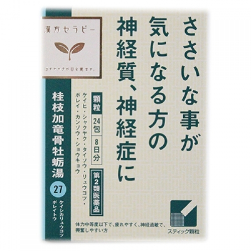 | 「桂枝加竜骨牡蛎湯」は,漢方の古典といわれる中国の医書「金匱要略(キンキヨウリャク)」に収載されている薬方です。ふだん手のひらがじっとり湿っている神経質タイプで,手足がだるくて疲れやすい,頭がのぼせ,眠れず胸や腹部の動悸を自分で感じる,気分が憂うつで物忘れしやすく,さ細なことにも興奮しやすい症状のある場合に用いられています。 体力中等度以下で疲れやすく,興奮しやすいものの神経質,不眠症,小児夜泣き,夜尿症,眼精疲労に効果があります。 |