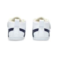 歩きはじめの約3カ月間の赤ちゃん向けに展開する「FIRST」シリーズのキッズシューズ。つま先を大きく巻き上げる形状でつまずきにくくし、軽く屈曲性に優れたカリフォルニア製法により、スムーズな歩行をサポートします。さらに靴底全体のエッジを丸くすることで、ぐらつきやすい赤ちゃんの歩行で起こりがちな引っかかりも軽減。足に触れるインナー材には、吸汗速乾性にすぐれ、肌に優しい低刺激性の素材「メディエル」を採用しています。フィット感の調節がしやすい2本ベルトで、履き口が大きく開くため脱ぎ履きもしやすいです。アッパーは軽くやわらかな風合いのマイクロファイバー人工皮革を使用しています。