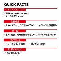 さらに、汗で失われた電解質を補給するだけでなく、エネルギーの補給にはクラスターデキストリン?と呼ばれる革新的な糖質を使用している。胃腸への 負担が少なく速やかに吸収される糖質だ。胃にもたれる等のパフォーマンスへの影響を気にせず飲み干せる。しかも糖質とペプチドを4:1という黄金比率で配 合することで スタミナ維持にもつなげてくれるだろう。