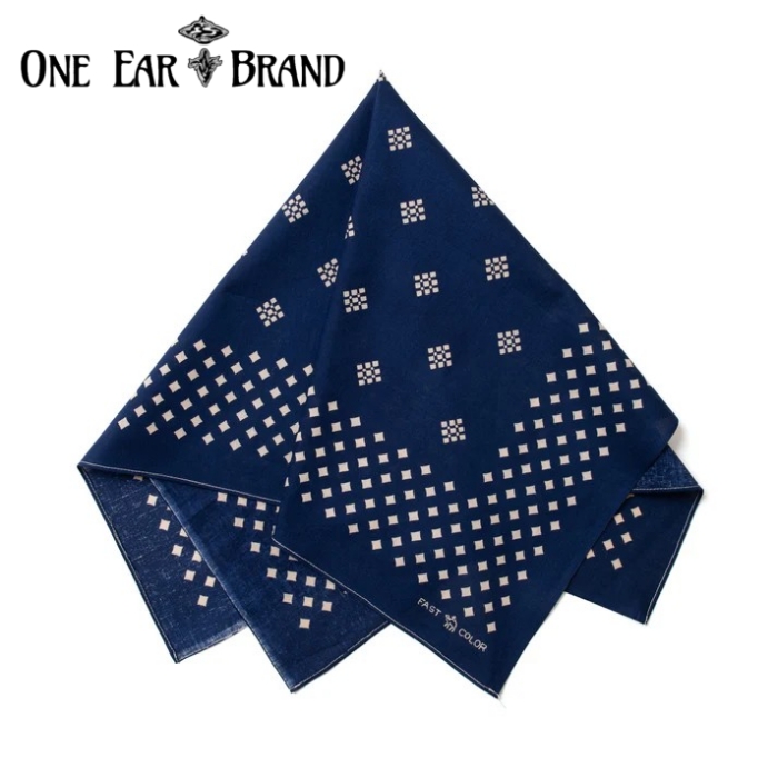 One Ear Brandのバンダナは100%日本製です。シャトル織りのバンダナは、90cm×90cmまたは70cm×70cmの生地に両サイドの耳が付いています。縮みが生じます。また、淡色は洗濯や日光に弱いため、ご注意ください。