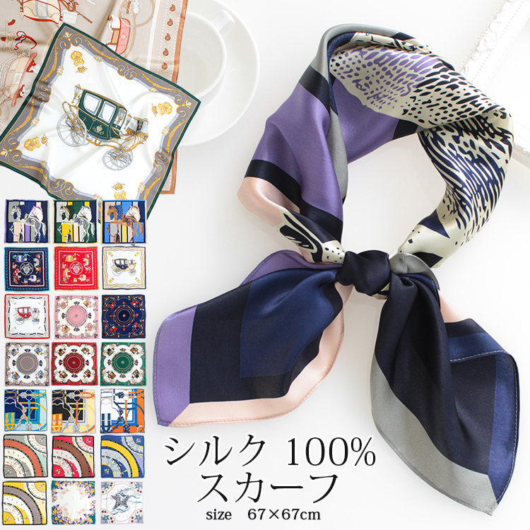 シルクスカーフ レディース 春 夏 秋 冬 用 絹 シルク 100 % 馬 馬車 柄 正方形 68×68cm 全40色 d3 クリスマス