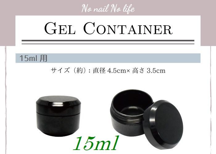 ■メール便送料無料(配送方法で、メール便を選択してください) ■ジェルネイル、ネイルアートに大変便利な空容器です。ジェルの小分け、保存に最適なコンテナです。光を通しにくい黒色で肉厚な空容器ですので、ミキシング下ジェルをの保管に便利です。パウダーやラメ、ホログラム等の各種パーツの保管にもご使用出来ます。 ●プラスチック製 ●サイズ(約)・仕様:15ml→直径4.5cm×高さ3.5cm、中国製パッキン付き