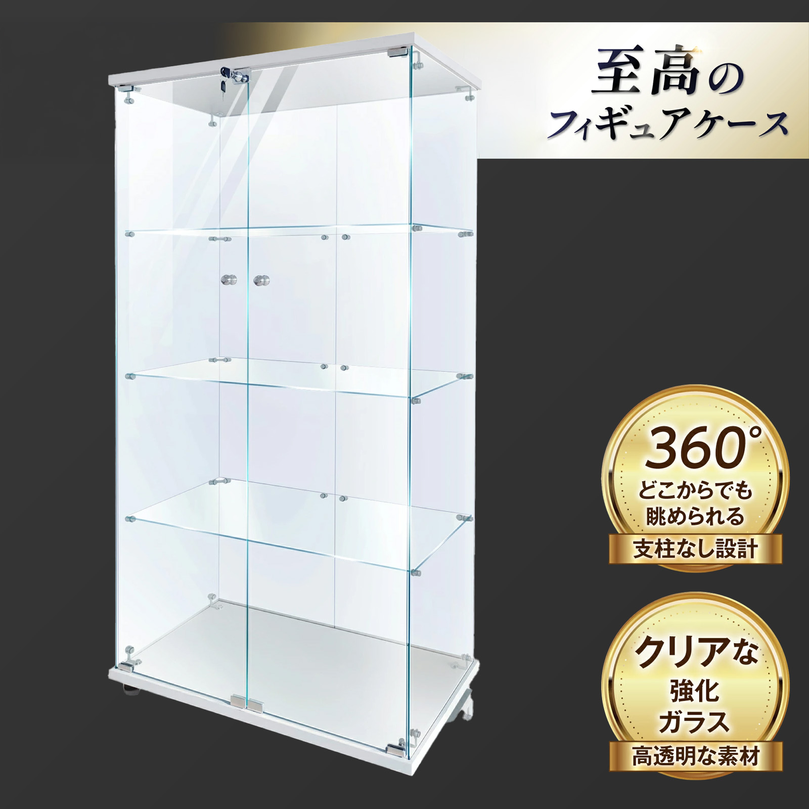 大事なコレクションの展示にピッタリの丈夫な強化ガラス使用。