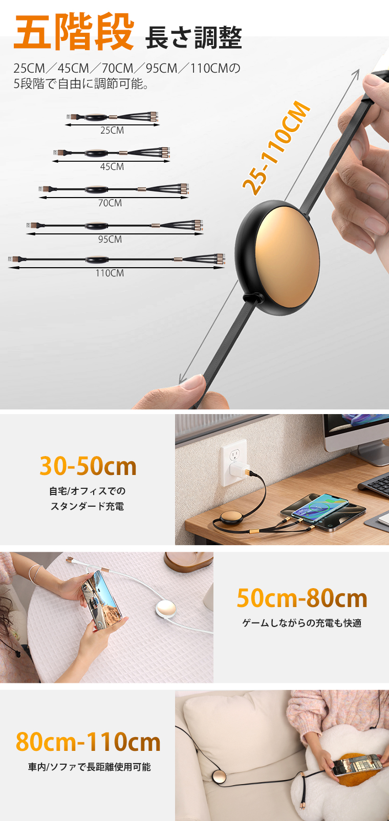 バッグの中でも絡まらず、車内やデスク上でもスマートに使える、まさに新時代のケーブル革命です。