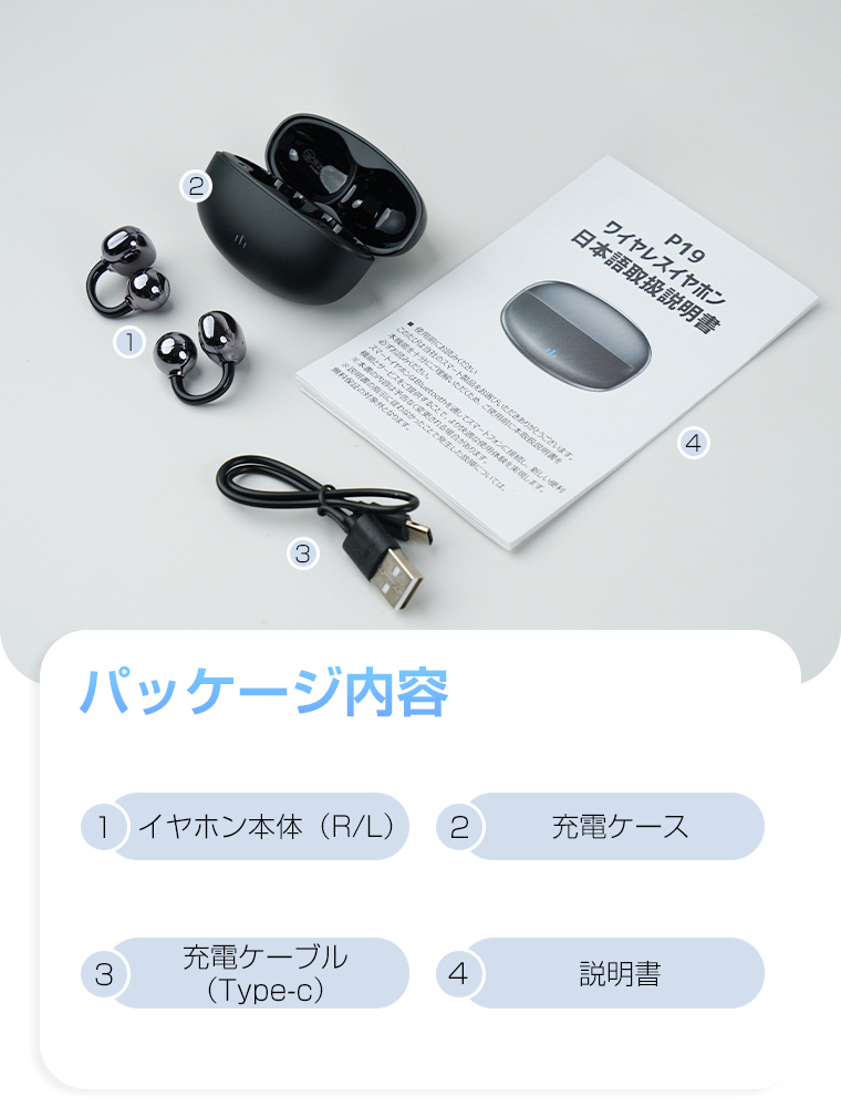 ・本体*1・充電ケース*1 ・日本語取り扱い説明書*1・充電用ケーブル(28.5cm)*1