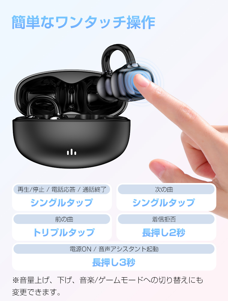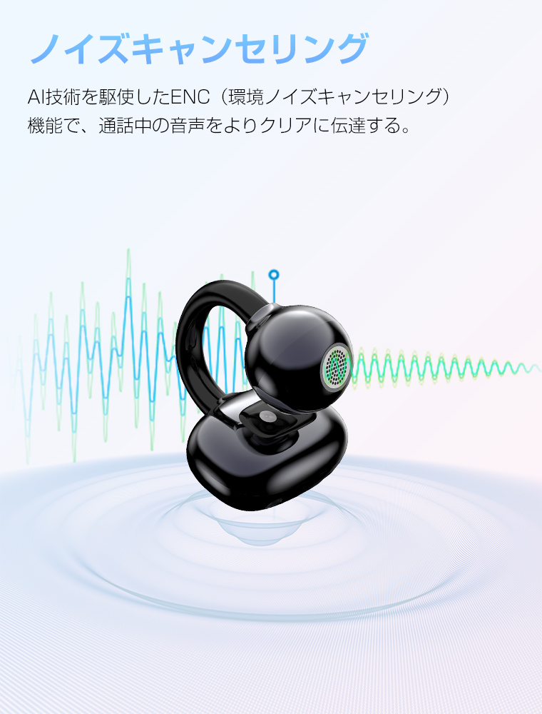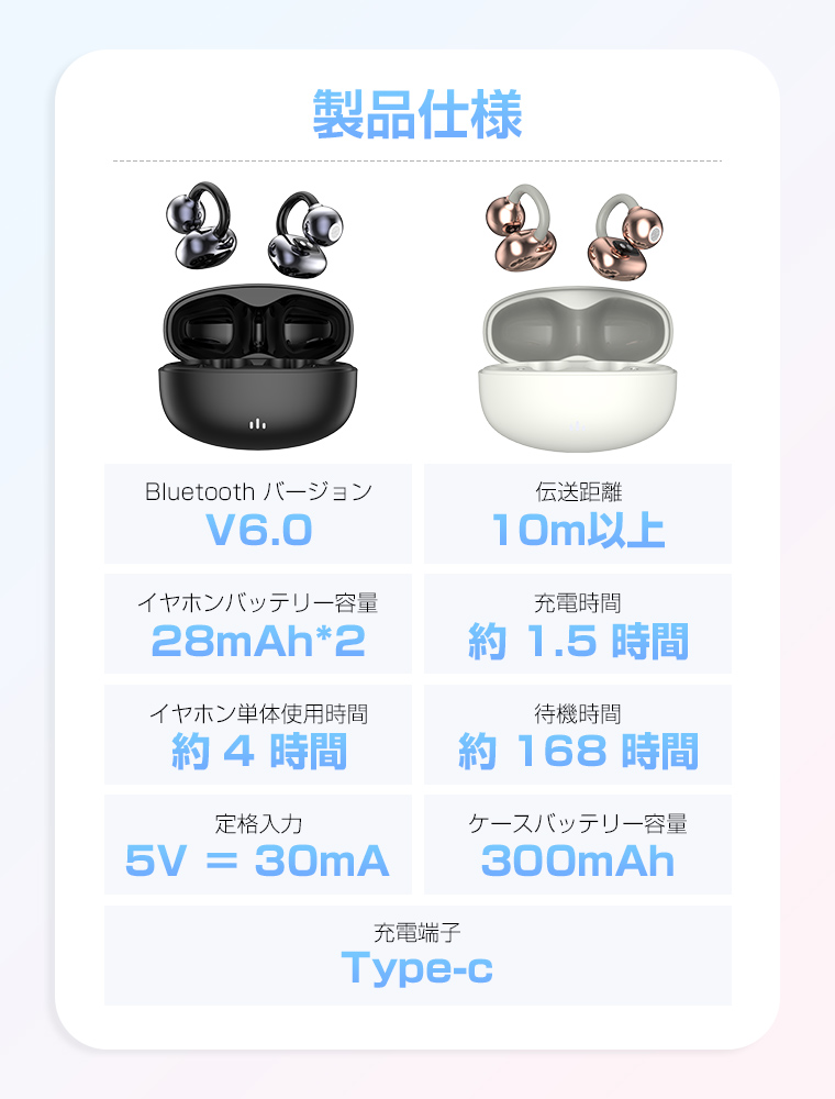 ・商品名:イヤーカフ型 ワイヤレスイヤホン・片耳重さ:約4.0g・充電ケースバッテリー:300mAh・充電時間:約1.5時間・再生時間:約24時間・待機時間:約168時間・動作電流:10〜20mA・通信距離:10〜20m(バリアフリーライン)