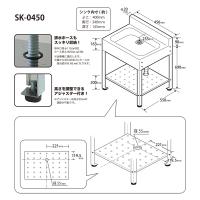 - 材質:(本体/棚板)SUS430、(パッキン)合成ゴム、(アジャスターネジ部)スチール、(アジャスター皿部)ポリエチレン、(排水栓)ABS樹脂、(ホース)塩化ビニール80cm