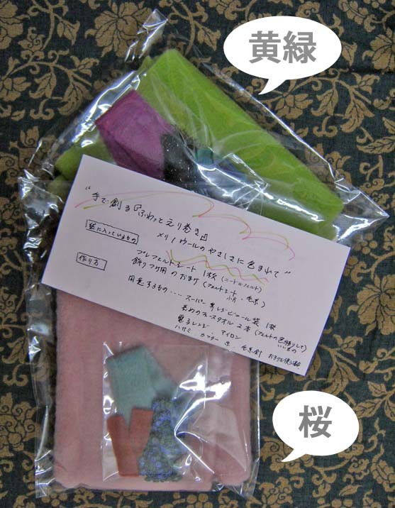 キット内容:メリノウールの半フェルト状のシート(約84cm×18cm)1枚、飾り付け用のおまけ(毛糸やフェルトシートの小片など)、説明書
